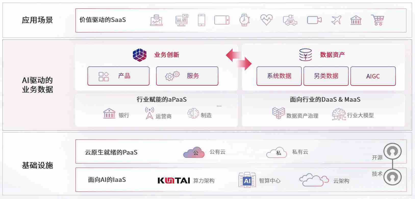 数字时代,,,围绕企业数字化转型的关键要素,,,尊龙z6数码开创性的提出数云融合战略和技术体系框架,,,,着力在云原生、、、、数字原生、、、AI原生和信创产业上架构产品和服务能力,,,,为处在不同数字化转型阶段的快消零售、、汽车、、金融、、医疗、、、、政企、、、教育、、、运营商等行业客户提供泛在的敏捷IT能力和融合的数据驱动能力,,构建跨界融合创新的数字业务场景和新业务模式,,,,助力企业级客户建立面向未来的核心能力和竞争优势,,,全面推动社会的数字化、、智能化转型升级。。。。